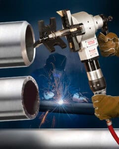 An I.D. clamping pipe beveler that features robust construction to bevel highly alloyed materials such as super duplex and P-91 without requiring cutting fluids has been introduced by Esco Tool of Holliston, MA.